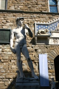 We lieten il Duomo achter ons en liepen verder door de Via dei Calzaiuoli, langs de Disney Store (ook al dicht), tot de straat ineens uitkwam op een groot plein vol toeristen, met aan de overkant een soort kasteelachtig gebouw met kantelen en een toren met een klok. Het Palazzo Vecchio. We vergaapten ons aan het gebouw dat machtig boven ons uittorende in de laatste zonnestralen van de dag. Toen zakte mijn blik naar beneden. En daarvoor, naast de ingang, stond dé David, van Michelangelo. Maar dan wel een kopie van het beeld van Michelangelo, want de echte stond natuurlijk veilig binnen in een museum.