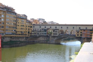 We vervolgden onze weg en verlieten het plein via een poort. Ineens waren de krioelende hoge gebouwen verdwenen en keken we uit over het water van de rivier de Arno. Aan de linkerkant, aan de overkant van het water, glooiden groene heuvels, terwijl aan de overkant recht tegenover ons de stad vrolijk verder uitdijde. Rechts zagen we een volgebouwde brug over het water, de Ponte Vecchio. Dat was vroeger een soort overdekte markt met slagers en leerlooiers en dergelijke, maar later bouwden de Medici een tunnel bovenop de winkeltjes, waar zich alleen nog edelsmeden mochten vestigen. Het gewone volk wilden ze er niet meer hebben.