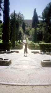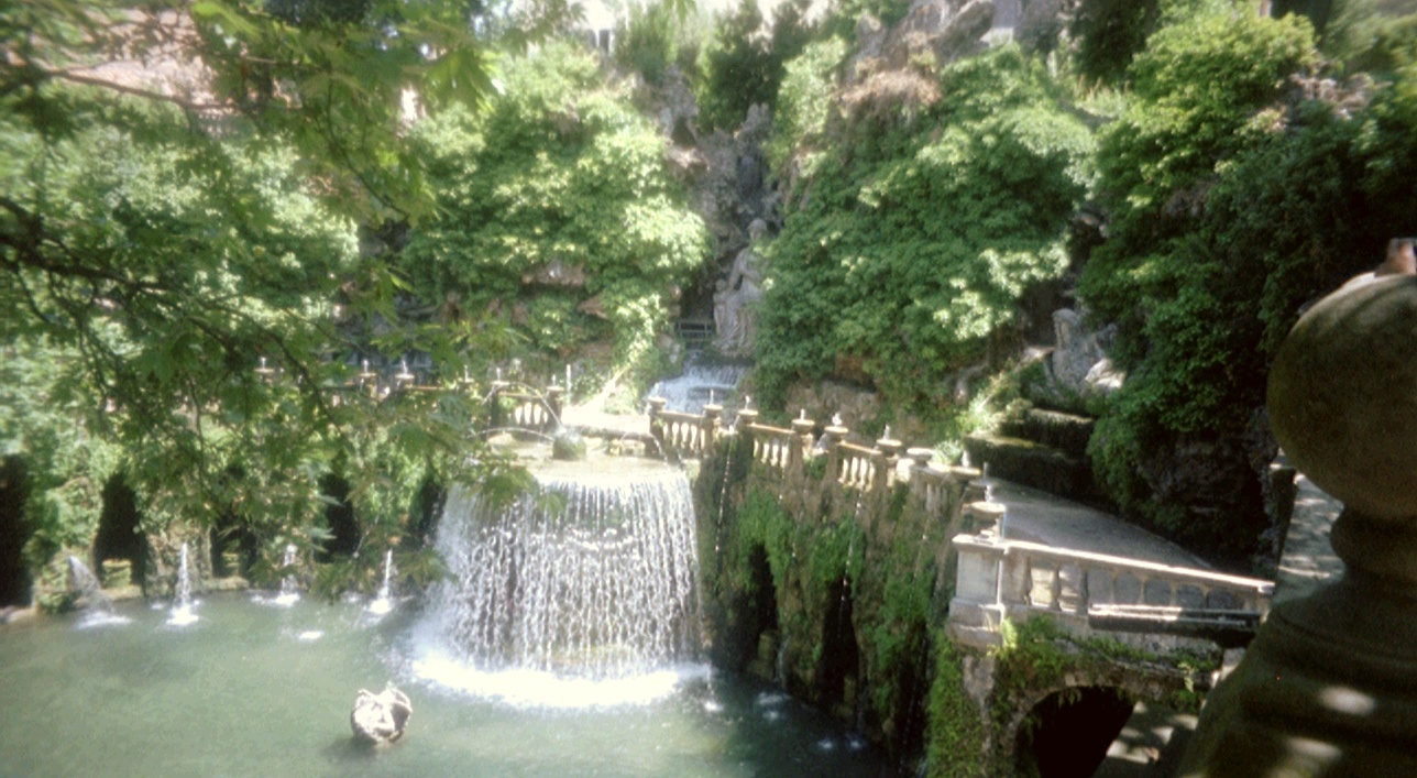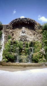 Bij een grote waterval-achtige fontein kwamen we tot stilstand. Zo op het eerste oog leek het alsof in de wand achter de waterval door groen omvatte nissen waren aangebracht, maar toen we beter keken, zagen we dat er een galerij achter langsliep. Heel even zag ik ons door de galerij lopen, verborgen voor de rest van de wereld, naar buiten glurend door de uitsparingen. Helaas bleek de galerij afgesloten te zijn voor publiek.