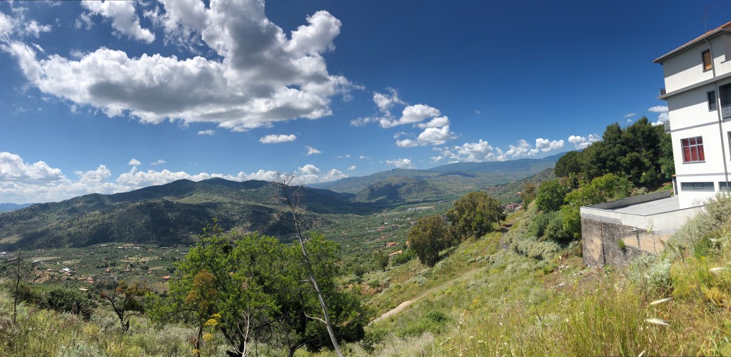 Aan de bestuurderskant glooide het landschap omhoog naar de Etna, terwijl het landschap aan de bijrijderskant afliep. Ver weg, aan de overkant van de vallei, kon ik een rug met nieuwe bergtoppen onderscheiden. Ze waren niet heel scherp zichtbaar doordat de lucht daar heiig was, maar ik kon wel verschillende kleuren begroeïng onderscheiden: donkergroen en geelgroenbruinig zoals verdord gras. Als een sierlijke plaid leek de aarde zich daarboven over de toppen te hebben gedrapeerd.